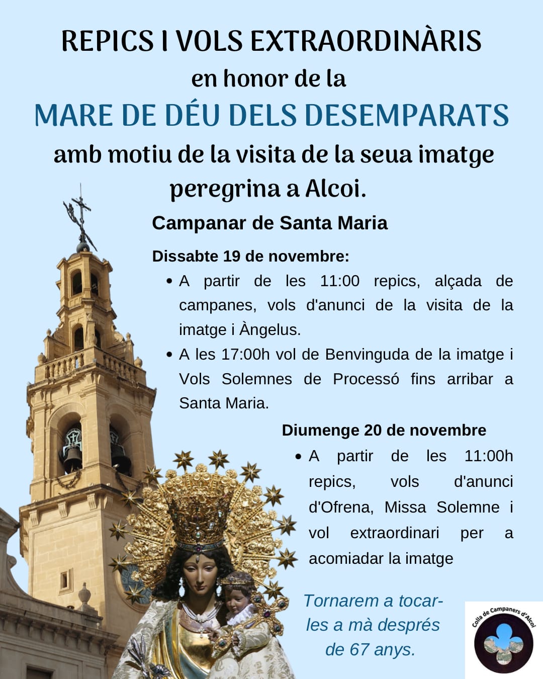 A més a més, amb motiu de la visita especial de la imatge pelegrina de la Mare de Déu dels Desemparats des de la Colla de Campaners d’Alcoi, realitzaran repics a ma a les 11.00 i a les 17.00 el dia 19 de novembre i també el dia 20 a les 11.00 hores. Desrpés de 67 anys les campanes de Santa Maria tornaran a tocar-se a mà.