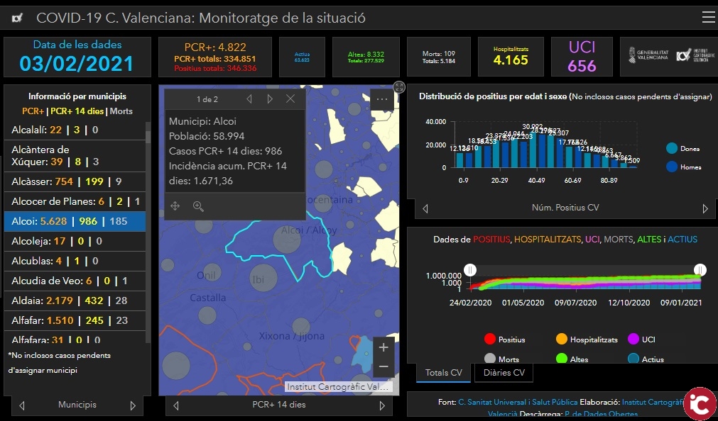 La incidencia acumulada por Coronavirus durante los últimos 14 días en Alcoy se sitúa en 1.671,36 casos por cada 100.000 habitantes. Los datos, actualizados este viernes por la Conselleria de Sanidad Universal y Salud Pública, contrastan con los 2.101 casos por cada 100.000 habitantes de la anterior actualización -la del pasado martes, 2 de febrero- y quedan muy alejados de los 2.730,79 casos por cada 100.000 habitantes que se registraban el pasado 26 de enero. En concreto, en los últimos 14 días se han detectado 986 casos positivos tras la realización de pruebas PCR.