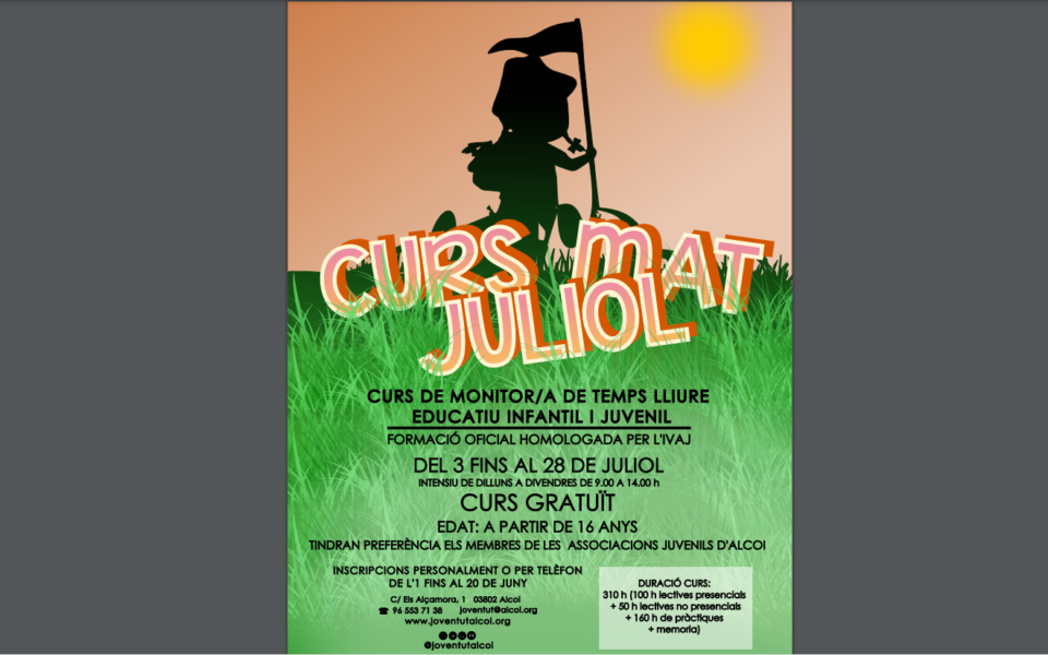 La regidoria de Joventut ha organitzat un Curs de Monitor o Monitora d’Activitats de Temps Lliure Educatiu Infantil i Juvenil és una formació homologada per l’IVAJ, l’Institut Valencià de la Joventut. Les inscripcions es pot fer telefonant al 96 553 71 38 o de forma personal en el Centre Cervantes Jove en Els Alçamora, 1 fins al 20 de juny. L’edat mínima per apuntar-se són 16 anys. El curs que és gratuït té 35 places i tenen preferència els membres de les associacions juvenils d’Alcoi. El curs es durà a terme del 3 al 26 de juliol de dilluns a divendres en horari intensiu de 9 a 14 hores.