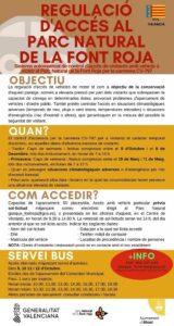 A més cal ressaltar que si desitja accedir en aquestes dates a l’àrea del Santuari de la Font Roja amb vehicle privat, s’ha de tindre en compte que l’aforament de l’aparcament està limitat a 50 vehicles, havent de sol·licitar-se reserva prèvia mitjançant correu electrònic dirigit al parc natural (parque_fontroja@gva.es) o presentant sol·licitud presencialment en les dependències d’aquest. La data límit per a la remissió de sol·licituds seran les 14 hores del dia anterior al que se sol·licita l’accés. Hauran d’indicar-se les següents dades: Nom del sol·licitant, DNI, Matrícula del vehicle, Data per al qual sol·licita accedir, Telèfon mòbil de contacte, Localitat de procedència i nombre de persones (informació opcional).