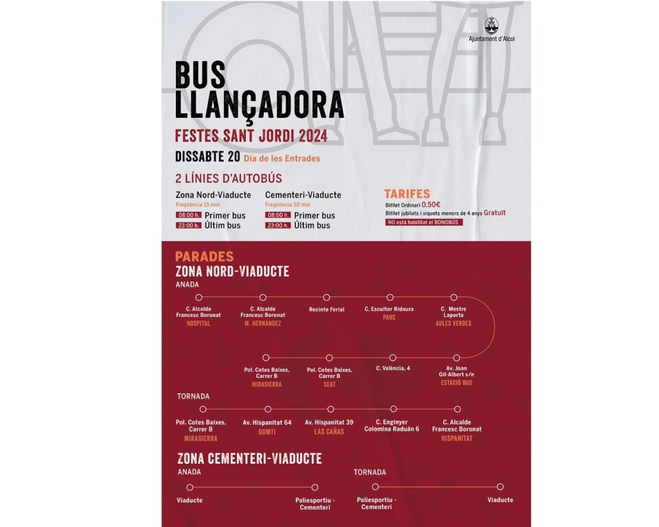 L’Ajuntament d’Alcoi habilitarà el dissabte dia 20 d’abril dues línies d’autobús llançadora que permetran connectar les entrades nord i sud amb el barri del Viaducte, amb l’objectiu de facilitar un any més la mobilitat de tots aquells que visiten la ciutat durant les Entrades de les festes de Moros i Cristians.