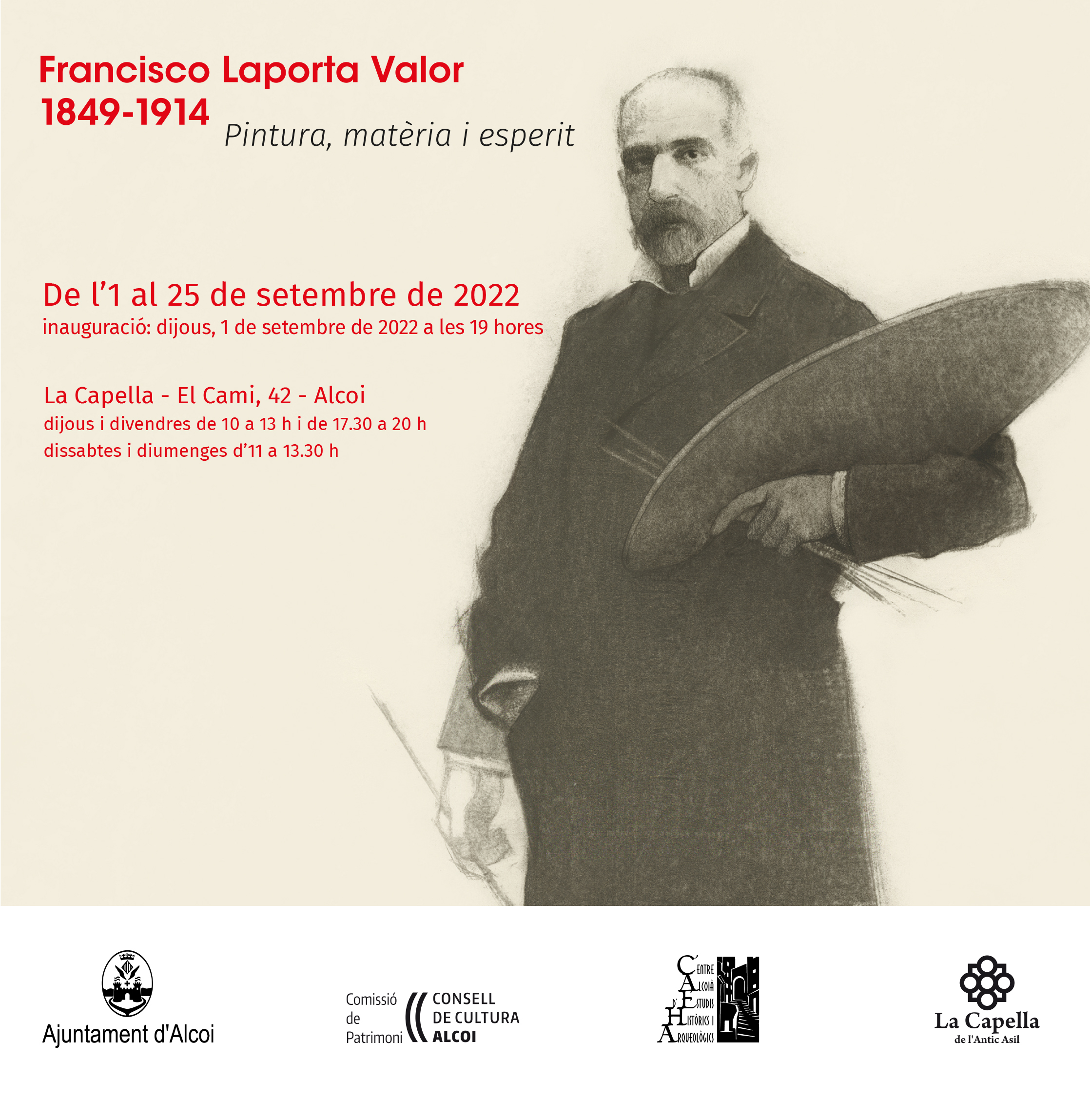 L’Ajuntament d’Alcoi ha organitzat una exposició titulada ‘Francisco Laporta Valor, 1849-1914. Pintura, matèria i esperit’. La mostra s’emmarca en els actes de la Setmana Modernista 2022 que homenatja a aquest artista alcoià. La inauguració serà aquest dijous 1 de setembre, a les 19 hores en la Capella de l’Antic Asil.