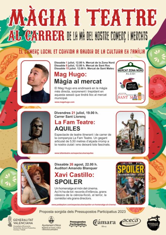 Durant aquest estiu Alcoi tindrà una programació de màgia i teatre per a tota la família. Aquesta va ser la segona proposta més votada dins de la part de despesa corrent dels pressupostos participatius 2023 i es durà a terme gràcies al treball de forma transversal de tres regidories: Democràcia Participativa, Cultura i Comerç. Hi haurà tres espectacles diferents al carrer i als mercats, en concret, Mag Hugo: Màgia al Mercat, Aquiles de La Fam Teatre i Spoiler de Xavi Castillo.