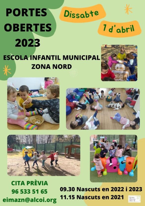 - Escola Infantil Municipal «ZONA NORD». Ha dividit els horaris d’assistència segons l’any de naixement dels xiquets. D’aquesta manera, les famíllies de xiquets o xiquetes nascudes al 2022 i 2023, podran accedir-hi a les 9.30 h, mentres que les famílies dels xiquets i xiquetes nascudes al 2021, ho podran fer a les 11.15 h. Cal concertar cita en el telèfon 965335165 o eimazn@alcoi.org