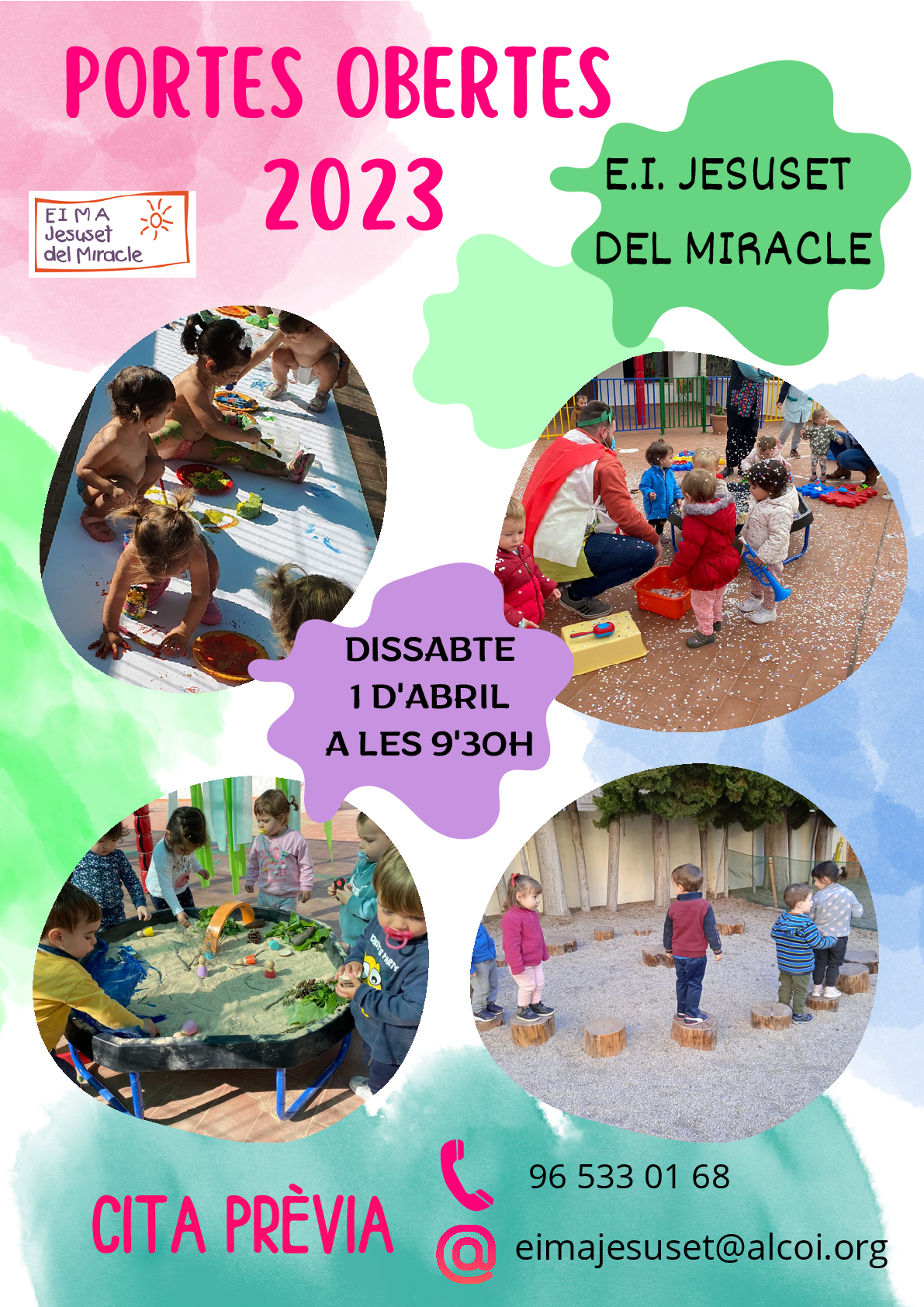 - Escola Infantil Municipal «JESUSET DEL MIRACLE». Obrirà les seues portes a les 9.30 h. Per a demanar cita prèvia es pot telefonar al 965330168 o enviar un correu electrònic a l’adreça eimajesuset@alcoi.org.