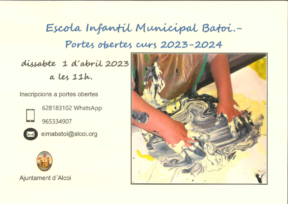 - Escola Infantil Municipal «BATOI». Obrirà les seues portes a les 11 h. Cal concertar cita trucant als telèfons 628183102 / 965334907 o bé enviar un correu a eimabatoi@alcoi.org