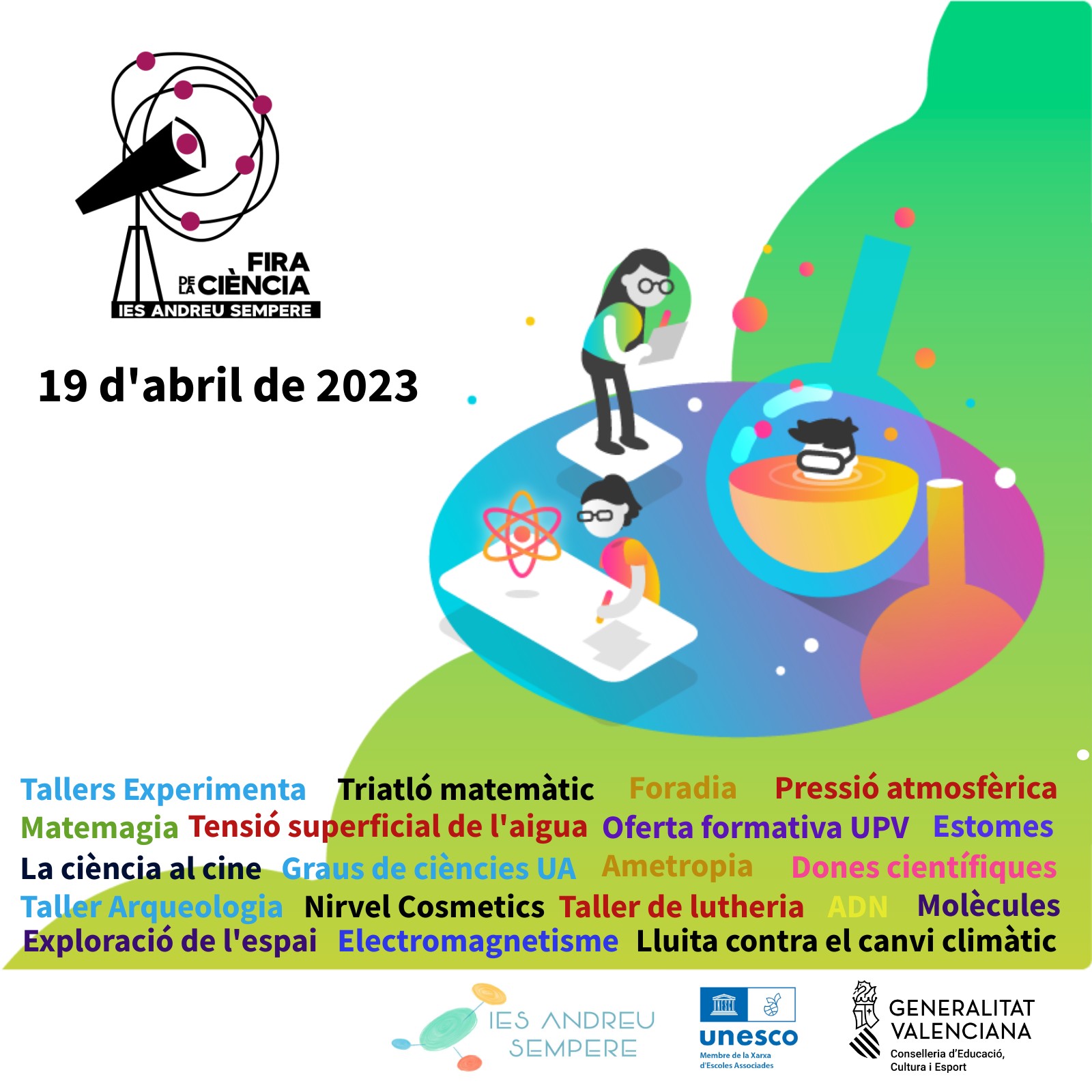 L’IES Andreu Sempere posa en marxa la I Fira de les ciències que tindrà lloc el proper dimecres 19 d’abril. Al llarg de tot el matí, l’alumnat de 1r d’ESO a 1r de Batxillerat participarà en diferents tallers sobre pressió atmosfèrica, estomes, ADN, molècules, dones científiques, electromagnetisme i triatló matemàtic essent els propis alumnes els presentadors de les activitats.