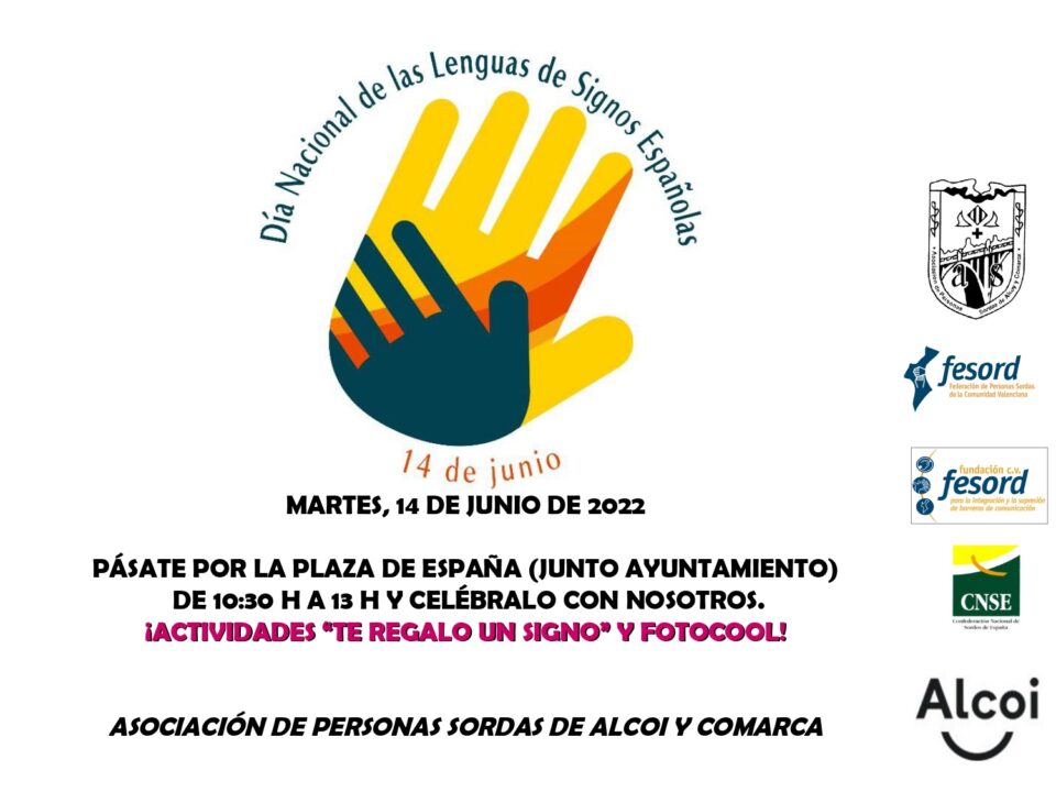 La Asociación de Personas Sordas de Alcoy y Comarca pondrá una mesa informativa el próximo martes 14 de junio en horario de 10.30h a 13.00h en la Plaza de España, para poner en valor la importancia de las lenguas de signos en la vida de las personas sordas, y hacer partícipe de este patrimonio lingüístico a la ciudadanía.