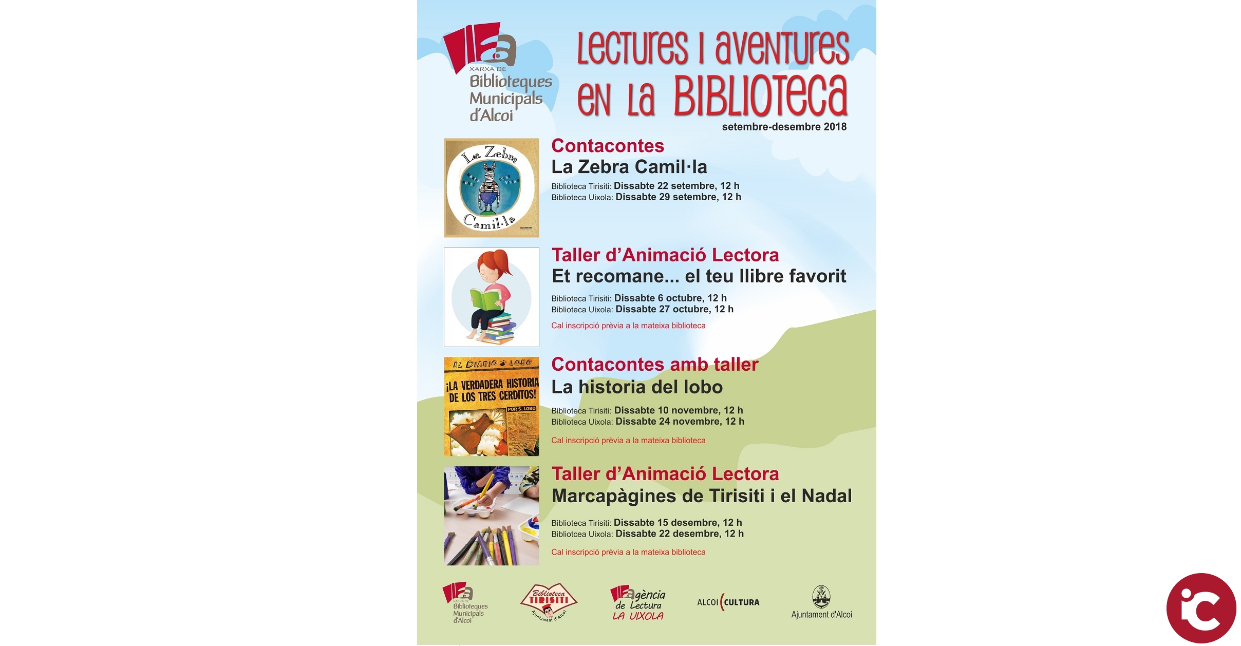 La Xarxa de Biblioteques Municipals dAlcoi ha presentat la programació infantil per al darrer quadrimestre de lany. Les iniciatives tindran lloc durant 8 dissabtes a les 12 del migdia i es realitzaran tant a la Biblioteca Infantil Tirisiti, situada al centre de la ciutat, com a lAgència de Lectura Uixola en Santa Rosa.
