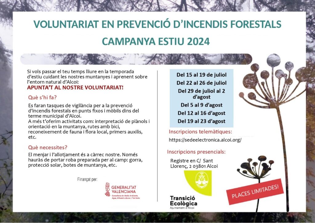Ja està obert el termini per inscriure’s en la Campanya 2024 del Voluntariat Mediambiental en prevenció d’incendis forestals. Aquest any hi haurà 6 torns: del 15 al 19 de juliol, del 22 al 26 de juliol, del 29 de juliol al 2 d’agost, del 5 al 9 d’agost, del 12 al 16 d’agost i del 19 al 23 d’agost.