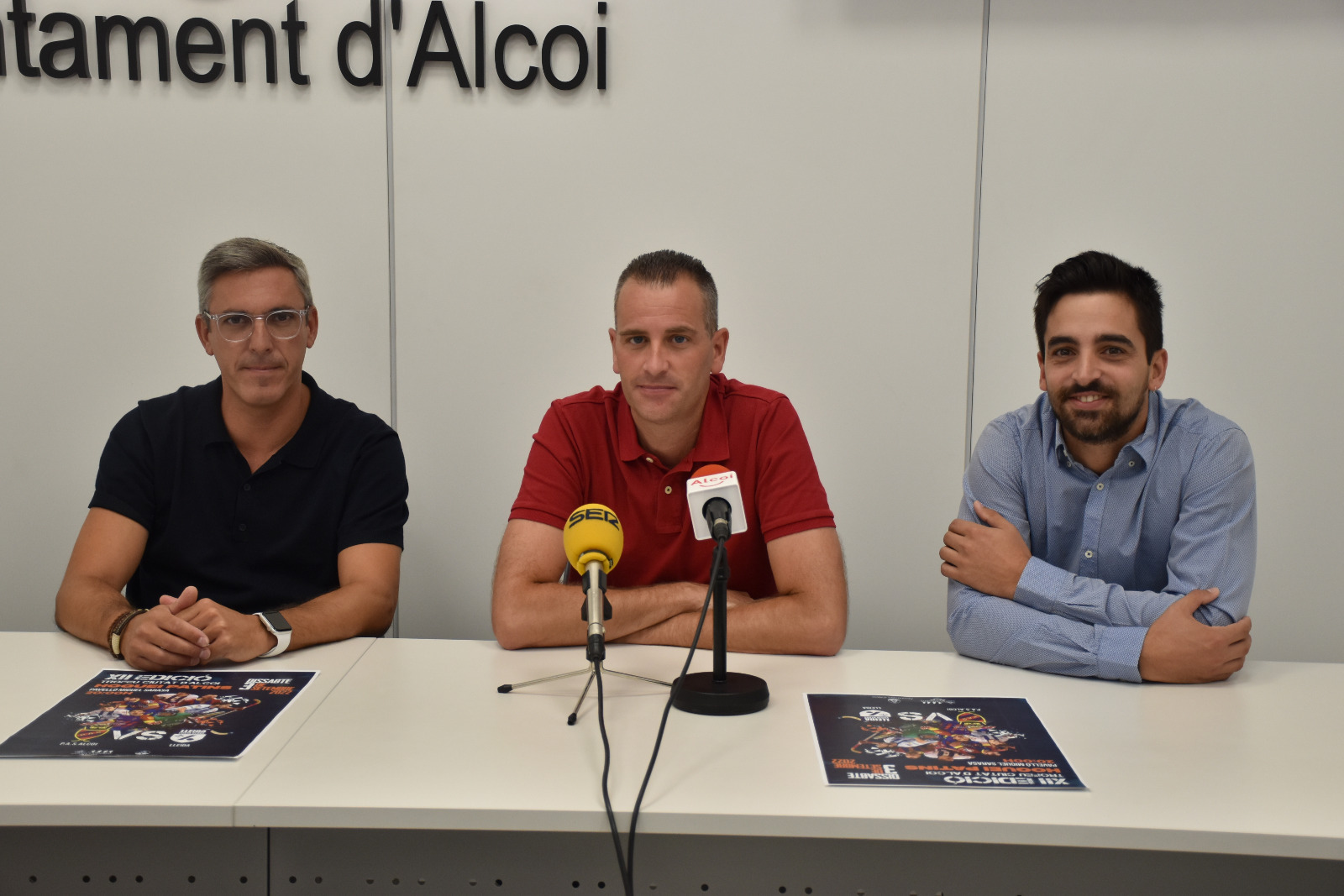 Presenten el partit el regidor d’Esports; Alberto Belda, l’entrenador del P.A.S. Alcoi; Lorenzo Pastor i el màxim golejador de l’equip; Ferran Formatjé.