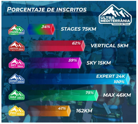 Desde que Ultramediterrània, Terres de Trail 2024 abriera el plazo de inscripciones el pasado 22 de julio, el nivel de participantes inscritos ha alcanzado el 49% de las plazas disponibles, un incremento del 15% a cierre de septiembre con respecto a la edición anterior.