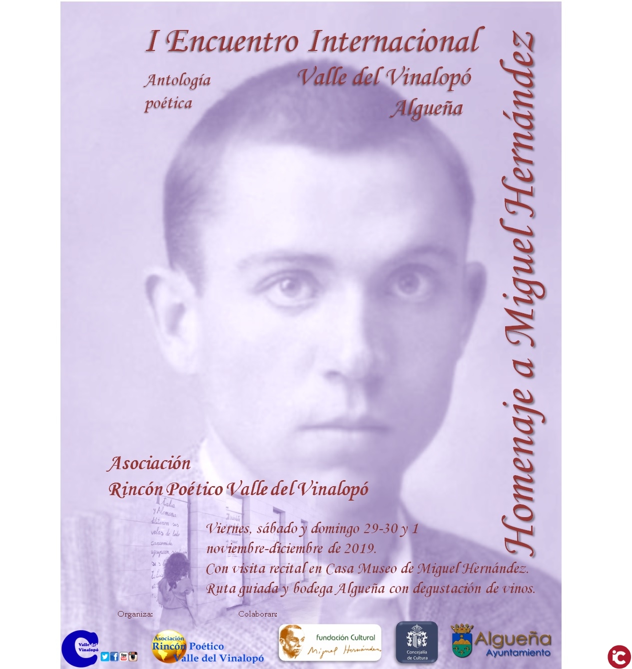 de recitar poemas de autor de la antología dedicados al poeta oriolano y donde también se recitarán poemas de él por los participantes en el encuentro y otros concretados. Tendremos ruta guiada y visita bodega Algueña con degustación de vinos; todo estará supervisado por Lucía Pastor y Luis Pascual Limiñana con la gran colaboración del Ayuntamiento de Algueña, agradeciendo también la aportación y colaboración de La Fundación Miguel Hernández y Cultura de Orihuela.