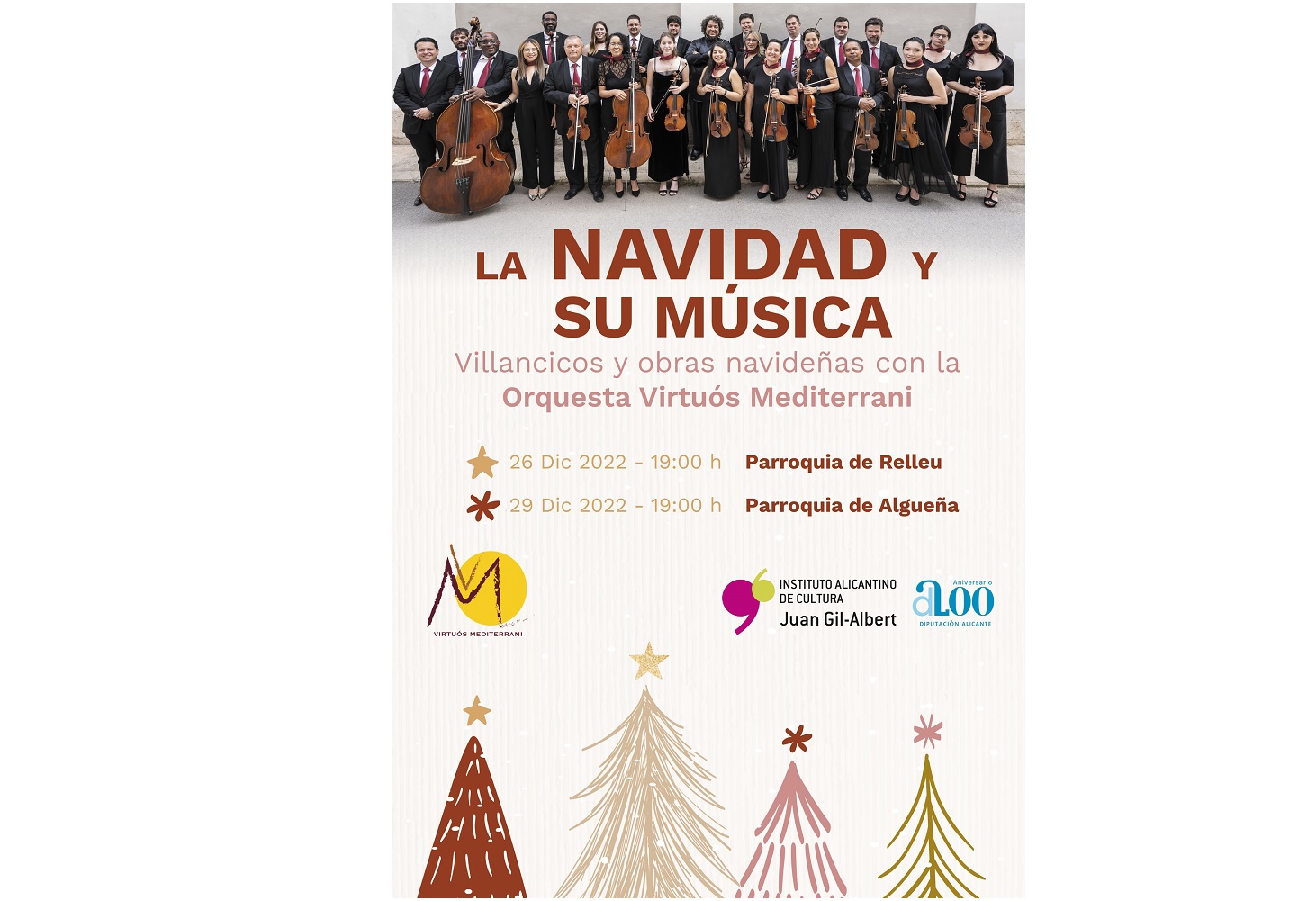 XX-12-22.- El Instituto Alicantino de Cultura Juan Gil-Albert ha organizado conciertos-conferencia para conmemorar las fiestas navideñas en la provincia. Los días 26 y 29 de diciembre las parroquias de Relleu y Algueña, respectivamente, acogerán estas audiciones a cargo de Virtuós Mediterrani, que también actuará en la cárcel de Villena en formato cuarteto el 4 de enero.