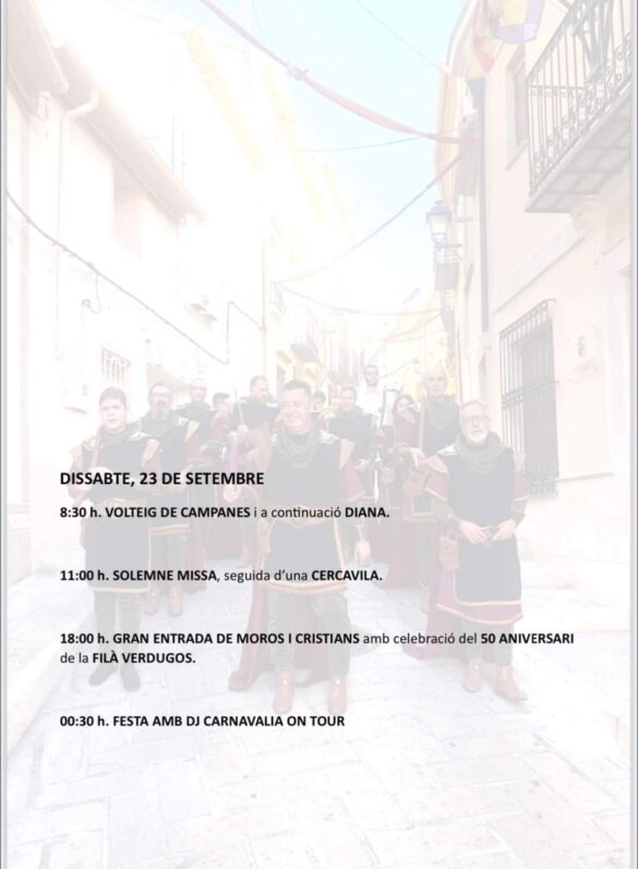Per al dissabte 23 setembre el dia tornarà a començar amb el volteig de campanes que donarà pas a la diana. Al matí continuaran els actes religiosos, i a la vesprada arribarà altre dels moments més especials d’aquestes setmanes de celebracions, l’entrada de Moros i Cristians. En aquest acte participaran unes 250 persones sense sumar totes les bandes de música. La nit finalitzarà amb una gran festa per a celebrar aquest dia tan esperat per als habitants de l’Alqueria d’Asnar.