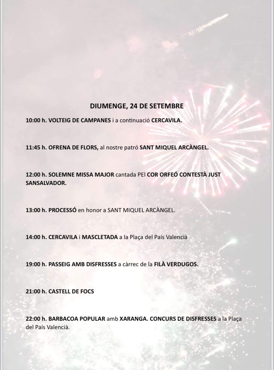 En el dia 24 de setembre, el dia es dedicarà al patró, Sant Miquel Arcàngel, a les 10h volteig de campanes i cercavila. A les 11:45h ofrena de flors al patró. A les 12h Solemne Missa Major canta pel cor orfeó contestà Just Sansalvador. A les 13h processó en honor a Sant Miquel Arcàngel. A les 14h cercavila i mascletada a la Plaça del País Valencià. A les 19h Passeig amb disfresses i a les 21h castell de focs. A les 22h es realitzarà una barbacoa popular amb xaranga i concurs de disfresses a la Plaça del País Valencià.