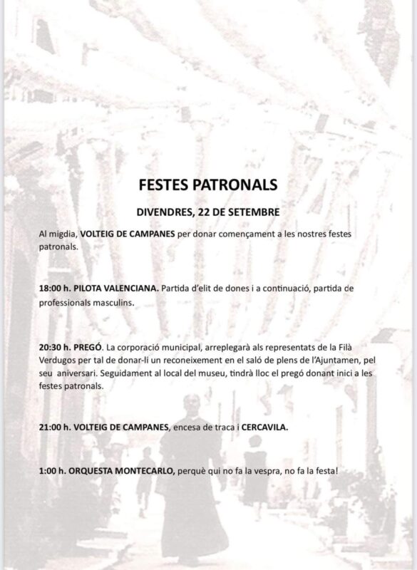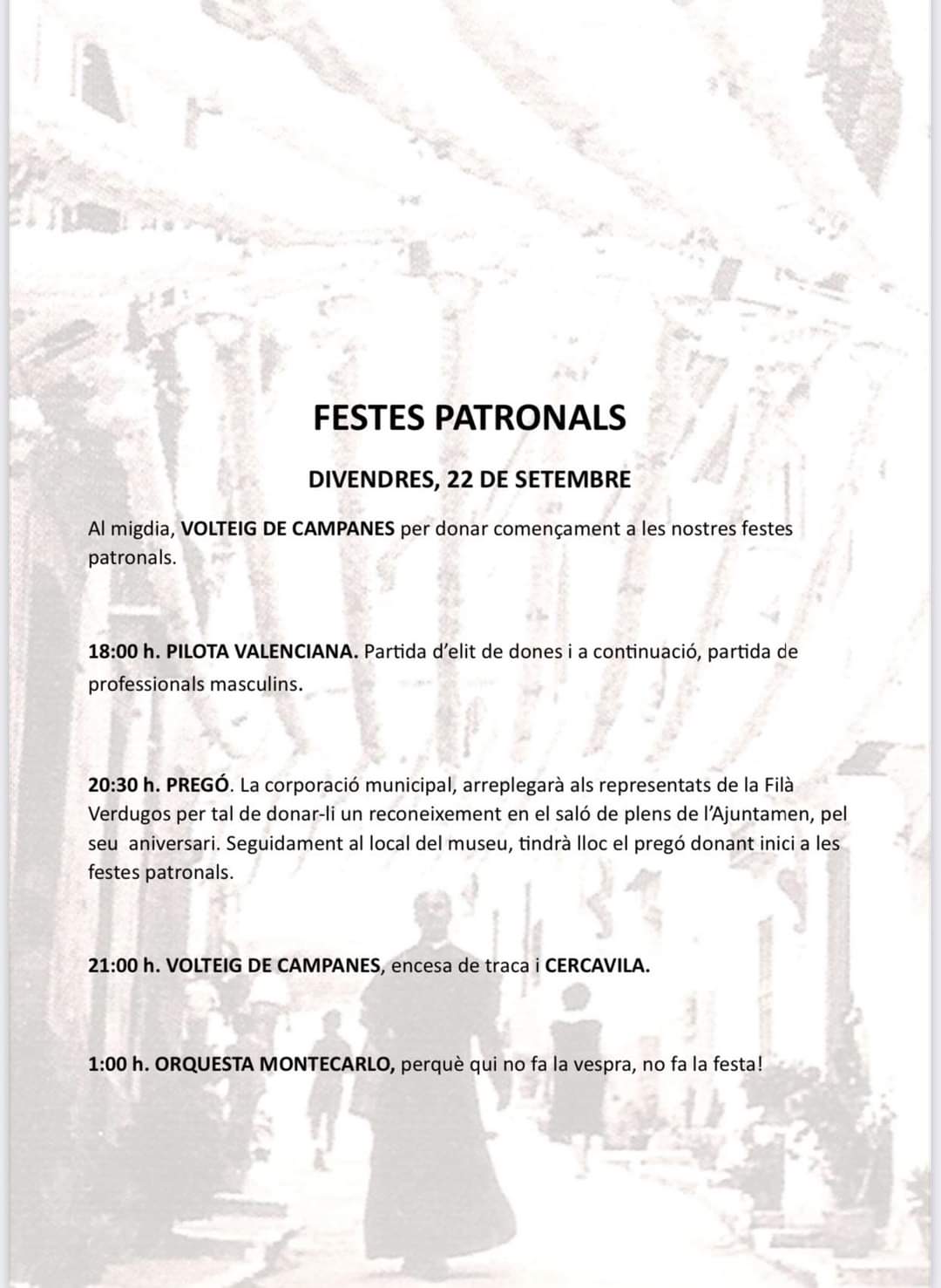 El divendres dia 22 de setembre, la festa s’obrirà amb un volteig de campanes, i donarà pas al partit de pilota valenciana amb jugadors i jugadores d’elit. Cap a les 20:30h tindrà lloc una de les novetats de les festes d’enguany, i és que, es farà un pregó en el qual s’aprofitarà l’ocasió per a retre homenatge a la Filà Verdugos pel seu 50 aniversari. Finalitzat el pregó es farà un nou volteig de campanes, castell de focs d’artifici i una cercavila. L’orquestra Montecarlo serà l’encarregada d’amenitzar aquesta primera nit de festes patronals.