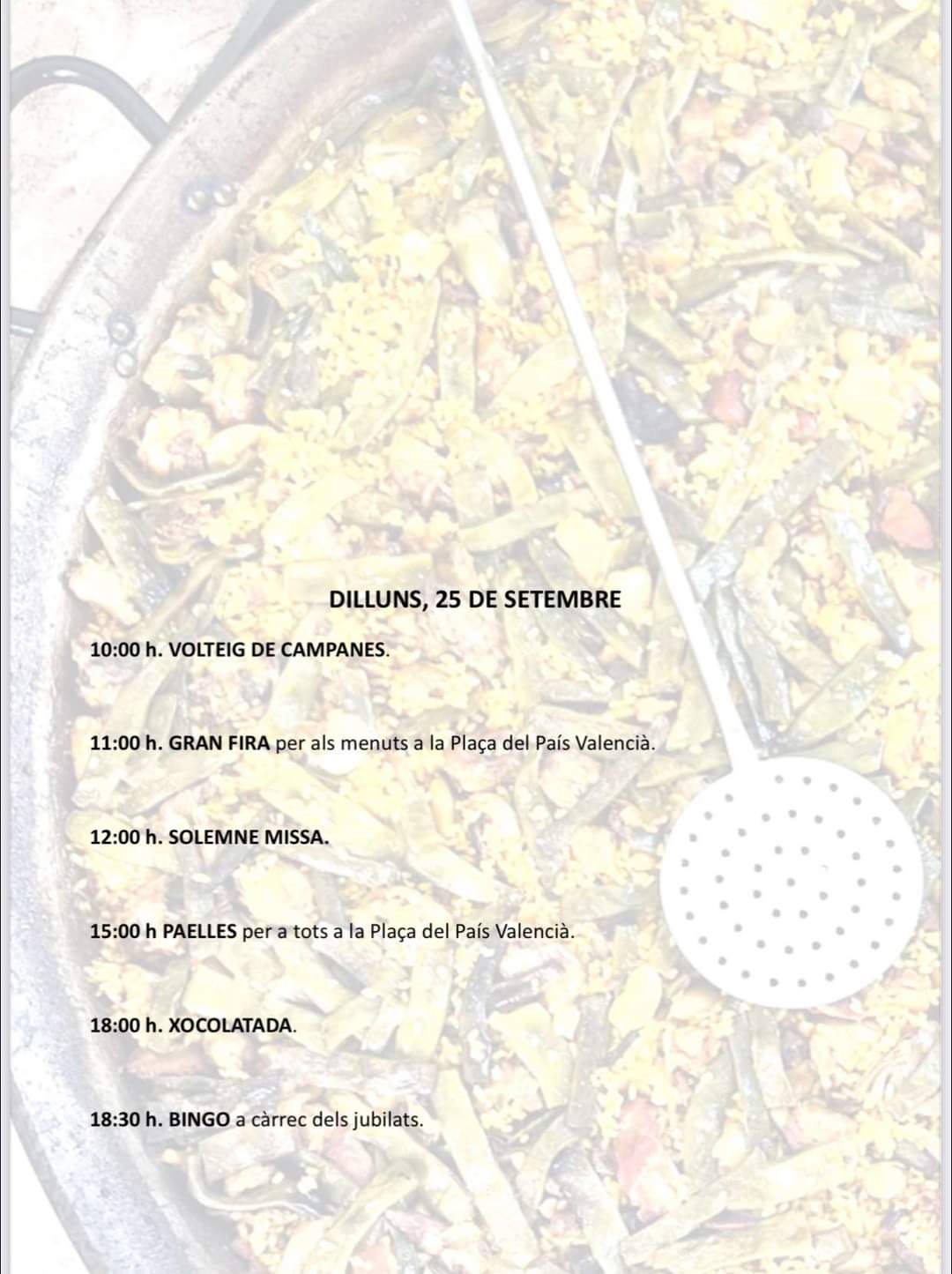 Per al dilluns 25 de setembre,a les 10h volteig de campanes i a les 11h gran fira per als menuts a la Plaça del País Valencià. A les 12h Solemne Missa i a les 15h Paelles per a tots a la Plaça del País Valencià. A les 18h tots a berenar xocolatada i a les 18:30h a jugar al Bingo