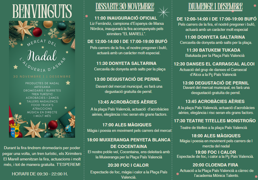 Amb un programa ple d’activitats, el mercat obrirà les seues portes des de les 9:30 fins a les 22:00 hores, oferint una gran varietat de productes nadalencs, artesania local, tallers, i una àmplia gamma d’atraccions com acrobàcies, xanques i música en directe.