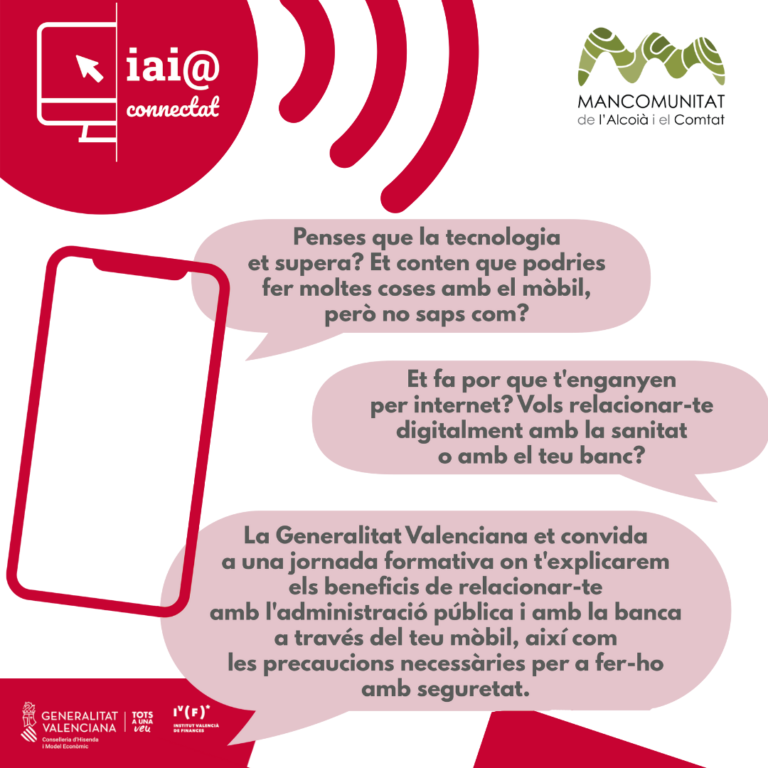 La Mancomunitat de l’Alcoià i el Comtat porta a les comarques els tallers iai@ connectat de l’Institut Valencià de Finances (IVF) i la Conselleria d’Hisenda i Model Econòmic. Amb aquestes sessions, es proporcionarà formació digital a les persones majors dels municipis perquè puguen aprendre com relacionar-se amb l’administració, el comerç i la banca amb major agilitat.