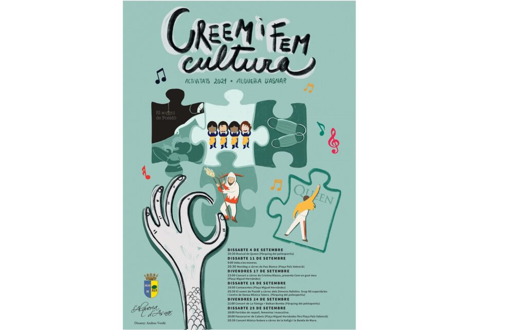 L’Alqueria d’Asnar, sota el títol «Creem i fem cultura», posa en marxa nombroses activitats culturals durant el mes de semtembre. Este dissabte, dia 11, a les 9:00h es durà a terme la volta a les moreres i, a les 20:30h» el monòleg a càrrec de Pau Balnco, a la Plaça País Valencià.