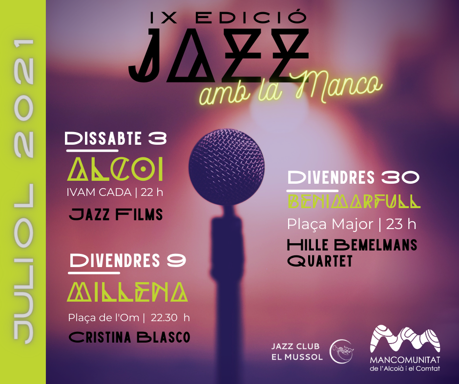 La Mancomunitat de l’Alcoià i el Comtat presenta la programació de la novena edició del cicle de concerts itinerants Jazz amb la Manco. Es tracta d’una de les propostes culturals amb més recorregut de la Mancomunitat. A l’edició d’enguany, que compta de nou amb la col·laboració de Jazz Club El Mussol, reconegudes bandes de jazz de la zona actuaran a tretze municipis de les comarques entre juliol i principis d’octubre.