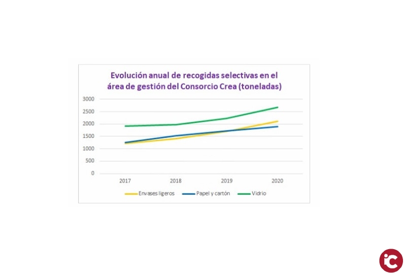 En los 14 municipios que forman parte del área de gestión del Consorcio de residuos Crea, se han recogido selectivamente en 2020 un total de 6.686 toneladas de residuos que los ciudadanos depositaron en los contenedores de envases ligeros (amarillos), papel/cartón (azules) y vidrio (iglús verdes), situados en la vía pública. Esta cifra sitúa el crecimiento del reciclaje en el área en un 18,34% con respecto a las 5.650 toneladas que se recogieron selectivamente en el año 2019.