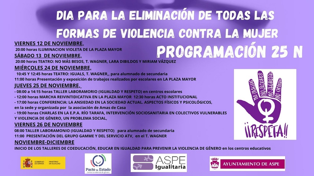 Actividades organizadas por el Ayuntamiento de Aspe para conmemorar el Día Internacional para la eliminación de la Violencia contra la Mujer