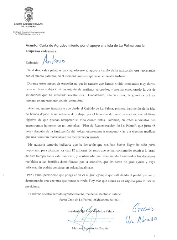 En una carta firmada por Mariano Hernández Zapata, el Presidente de La Palma, agradece la ayuda al municipio de Aspe, por la aportación económica y ayudas de los vecinos aspenses canalizadas a través de la Cruz Roja. Tanto el alcalde de Aspe, Antonio Puerto, y la Concejala de Solidaridad, Toñi García, muestran su satisfacción por el agradecimiento y por la esperada llegada interrupción de la expulsión de lava.
