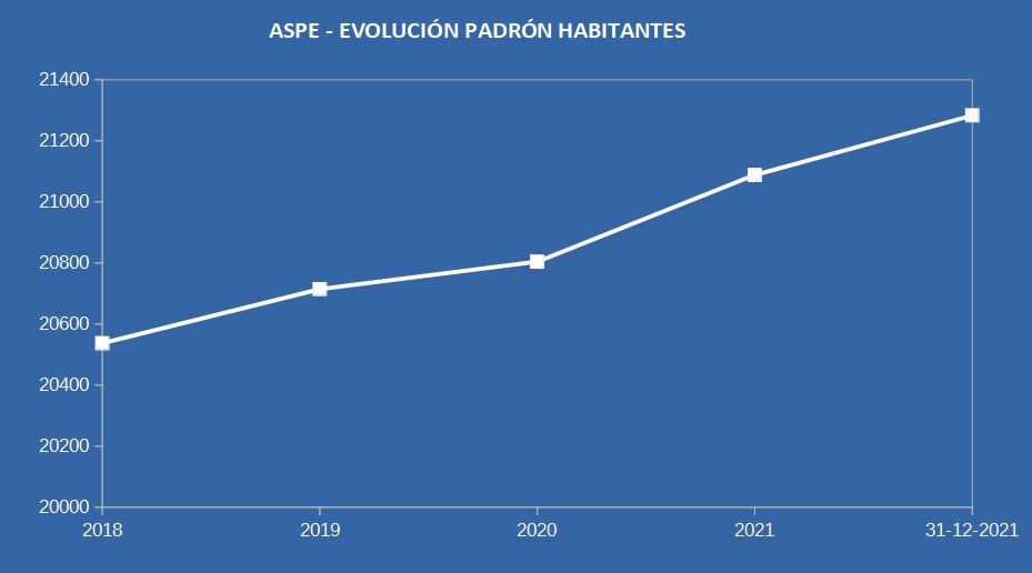 La tendencia alcista en la población aspense se continua y si bien el año 2020 se aumentó en 284, acabando 2021 con 21.088, este año se continua con el aumento de 195 habitantes más, superando la cantidad 21.283.