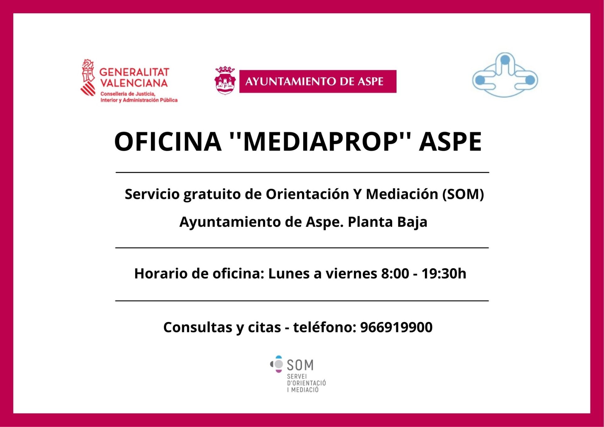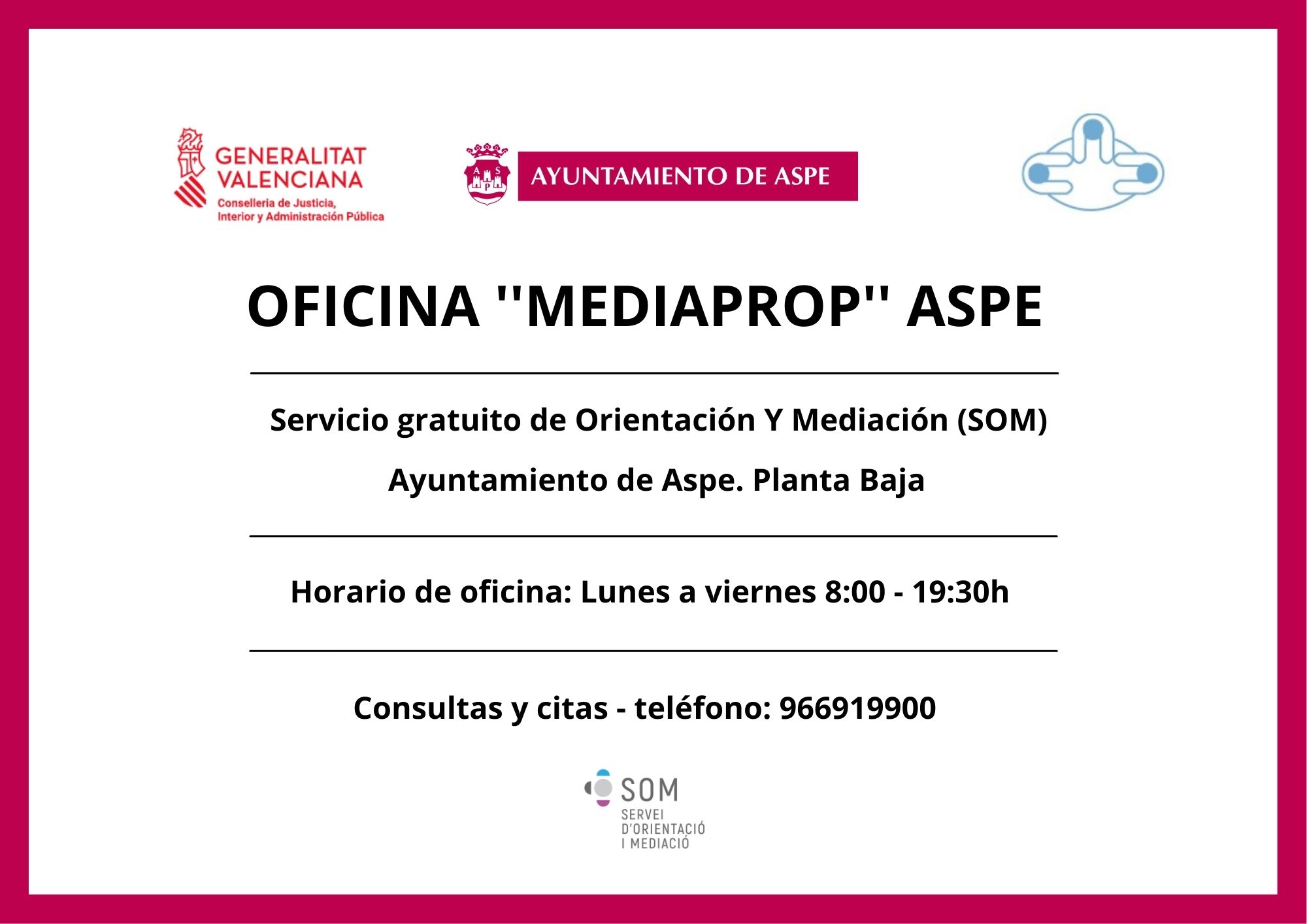 La Oficina Mediaprop ofrecerá el servicio a partir del 15 de junio a la ciudadanía de lunes a viernes en horario de 8.00 a 19.30 mediante cita previa. La oficina está ubicada en la planta baja del Ayuntamiento de Aspe.