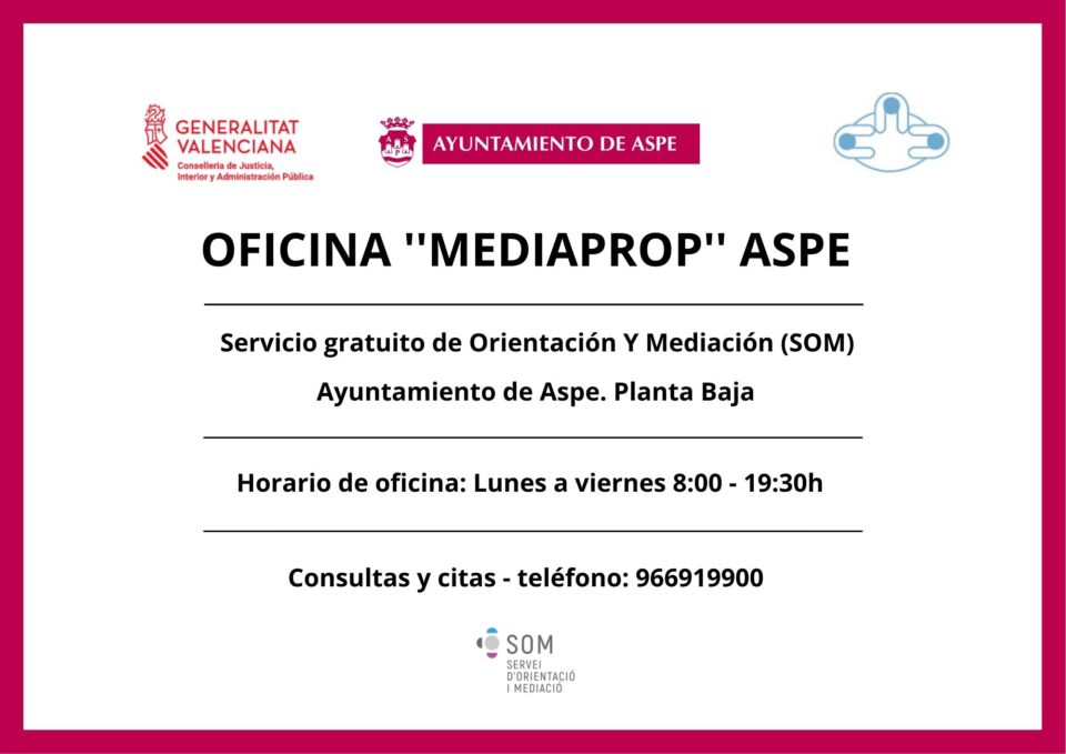 El Ayuntamiento de Aspe lanza el nuevo servicio Mediaprop, cuya finalidad es proporcionar atención e información a la ciudadanía sobre la mediación como alternativa al proceso judicial. El citado servicio esta financiado por la Generalitat y puesto a disposición de la ciudadanía de forma totalmente gratuita.