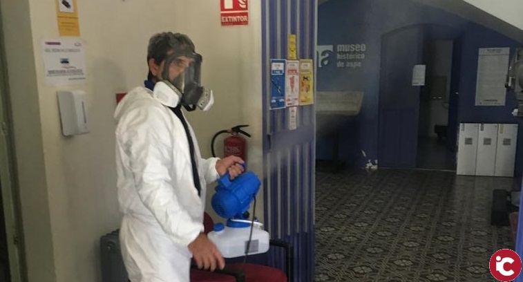 El pasado 3 de octubre se ha realizado la desinfección de choque contra el Covid-19 mediante nebulización en todos las Instalaciones Municipales y Edificios Públicos, con el objetivo de garantizar el buen funcionamientos de los servicios, siguiente la normativa y las recomendaciones sanitarias. El desinfectante aplicado es de amplio rango, y actúa por contacto directo dispensado partículas finas que permanecer en suspensión en el aire y se depositan en todas las superficies.