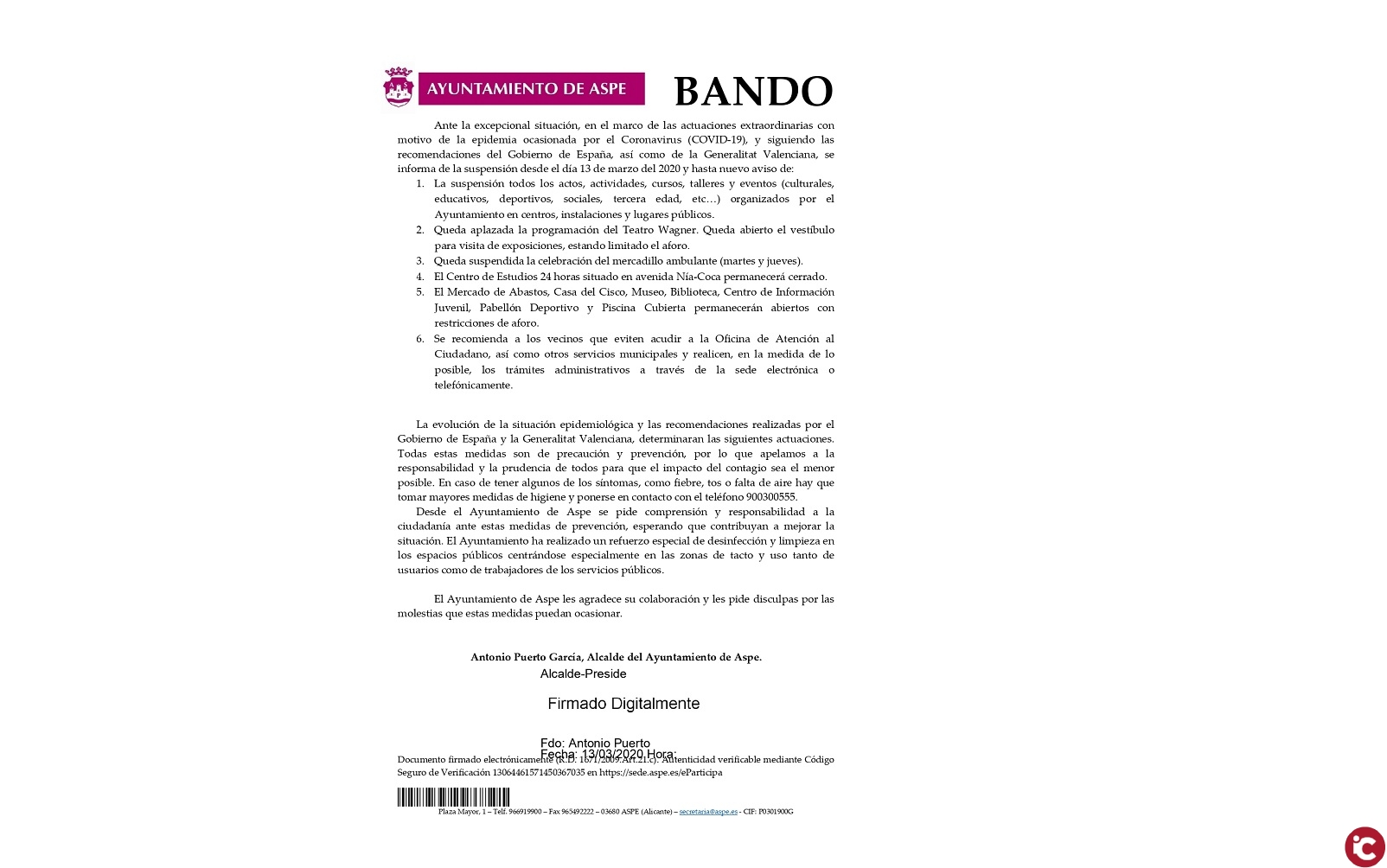 El Ayuntamiento de Aspe a dado a conocer un Bando Municipal con las medidas a llevar a cabo con motivo de la situación en la que se encuentra nuestro país y nuestra provincia ante el coronavirus.