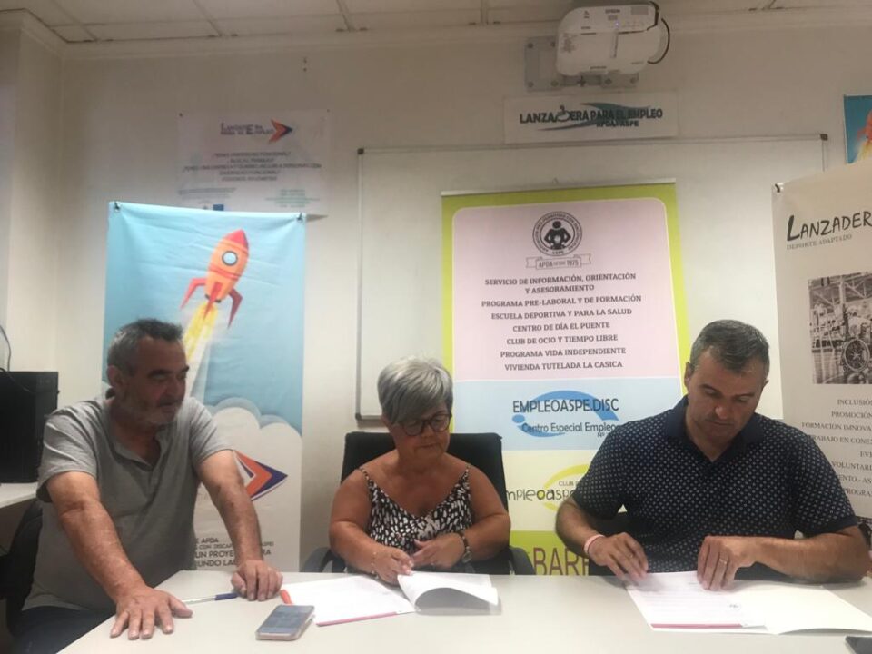 El alcalde de Aspe, Antonio Puerto, y la presidencia de la Asociación Pro-Personas con Discapacidad (APDA) Antonia Prieto han firmado un convenio el pasado lunes 25 de julio de 2022 con una colaboración por valor de 61.000 euros.
