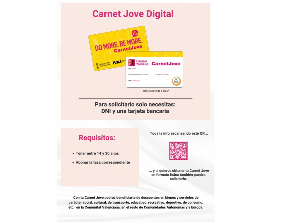El Institut Valencià de la Joventut, lanza el nuevo Carnet Jove digital. Las personas jóvenes interesadas en obtener el Carnet Jove pueden solicitarlo online y recibirán automáticamente el carnet digital en su correo electrónico. Esto permitirá que los usuarios y usuarias puedan llevarlo en su dispositivo móvil, lo que supondrá una mayor comodidad en su utilización.