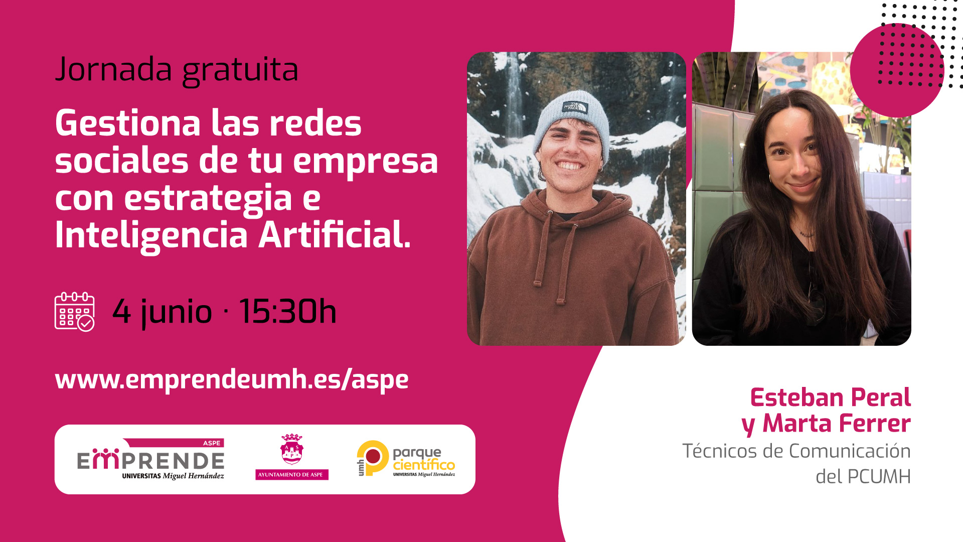 Esta sesión, enmarcada en el programa Aspe Emprende, tendrá lugar a las 15:30 horas en el coworking de la Agencia de Desarrollo Local de Aspe y estará a cargo de los técnicos del PCUMH Esteban Peral y Marta Ferrer. La asistencia es gratuita y está abierta al público en general, previa inscripción en www.parquecientificoumh.es/eventos/gestiona-las-redes-sociales-de-tu-empresa-con-estrategia-e-inteligencia-artificial-aspe-emprende.