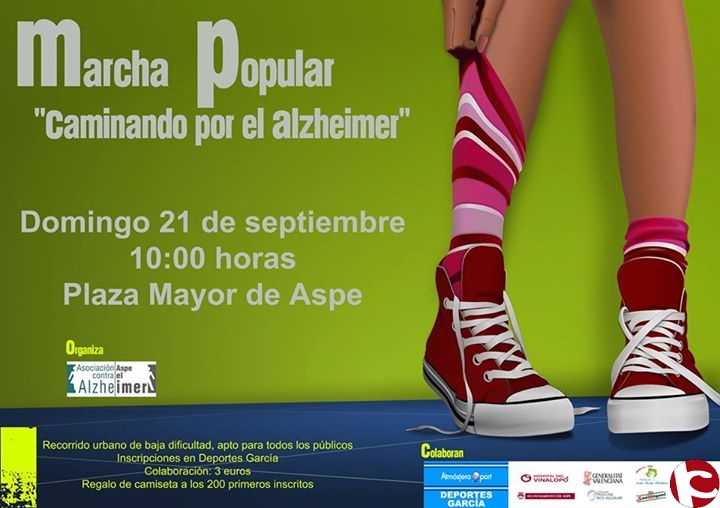 El próximo domingo 21 de septiembre con motivo del dia internacional del Alzheimer , a partir de las 10 de la mañana, se celebra en Aspe la Marcha Popular “Caminando por el Alzheimer”, que organiza la Asociación Aspe contra el Alzheimer en colaboración con el Ayuntamiento de Aspe y Vinalopó Salud.