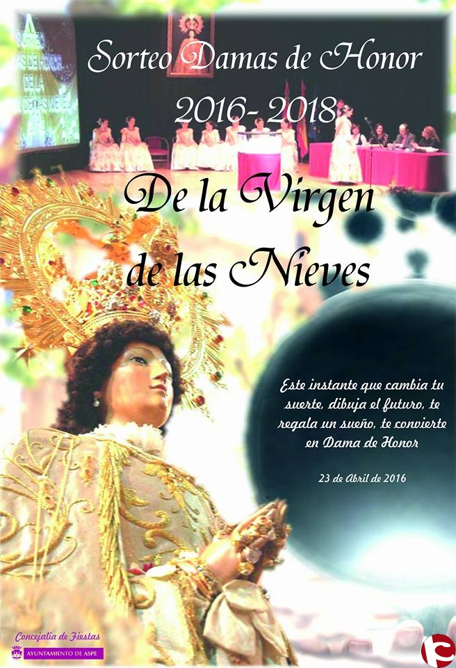 El Teatro Wagner será este próximo sábado el escenario del sorteo de las Damas de Honor de la Virgen de las Nieves para el periodo 2016-2018. Un total de 88 jóvenes aspenses de entre 18 y 23 años aspiran a ser las ocho elegidas que formen la corte de honor de la patrona de Aspe durante los dos próximos años.