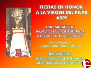 Los vecinos de las calles Nuncio y Ramón y Cajal de Aspe celebraron los actos conmemorativos de la festividad de la Virgen del Pilar. El sábado, día 10, a las 20:45, se realizó el traslado de bajada de la imagen de La Pilarica hacia la Basílica de Nuestra Señora del Socorro.