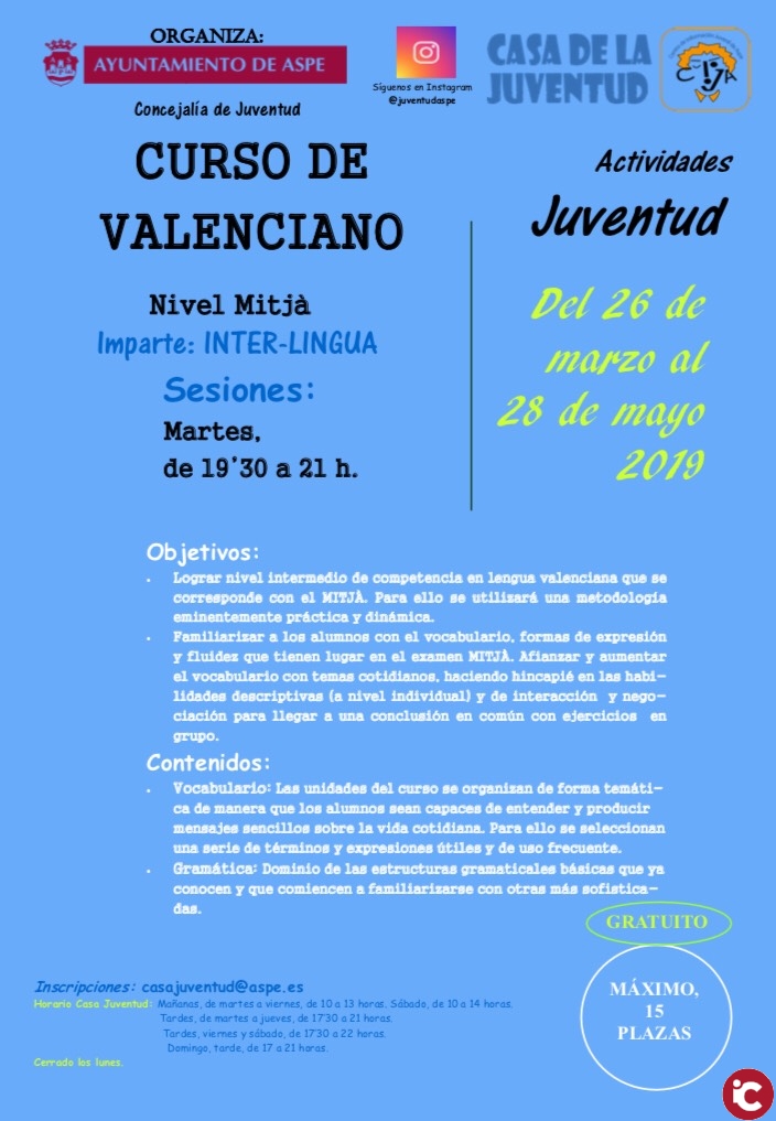La Concejalía de Juventud, dirigida por José Luis Martínez organiza un curso para preparar la prueba de la JQCV nivel Mitjà-C1.