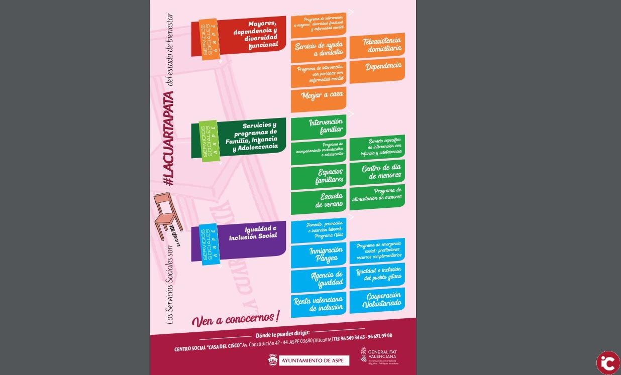 La concejalía de Bienestar Social ha presentado este lunes un vídeo que tiene como objetivo visibilizar a los Servicios Sociales municipales e informar a la ciudadanía de la cantidad de programas de carácter social que se llevan a cabo en Aspe. Este vídeo fue una de las acciones que se realizaron en la campaña de visibilización “La Cuarta Pata” realizada en abril y que además contó con una jornada en el parque Doctor Calatayud, así como reparto de información en folletos y presencia en los medios de comunicación locales y rediseño de la web municipal. También se creó un cartel de grandes dimensiones situado en la recepción del centro social Casa del Cisco donde se recoge la información de todos los programas de Servicios Sociales.