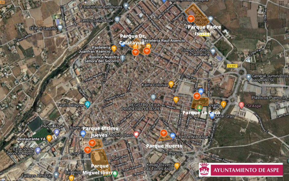 El Ayuntamiento de Aspe ha puesto en marcha la instalación de una red inalámbrica (wifi) que proporciona conexión gratuita a internet para los visitantes de los parques: Miguel Iborra, Último Jueves, Huerto, La Coca, Dr. Calatayud y Padre Ismael.