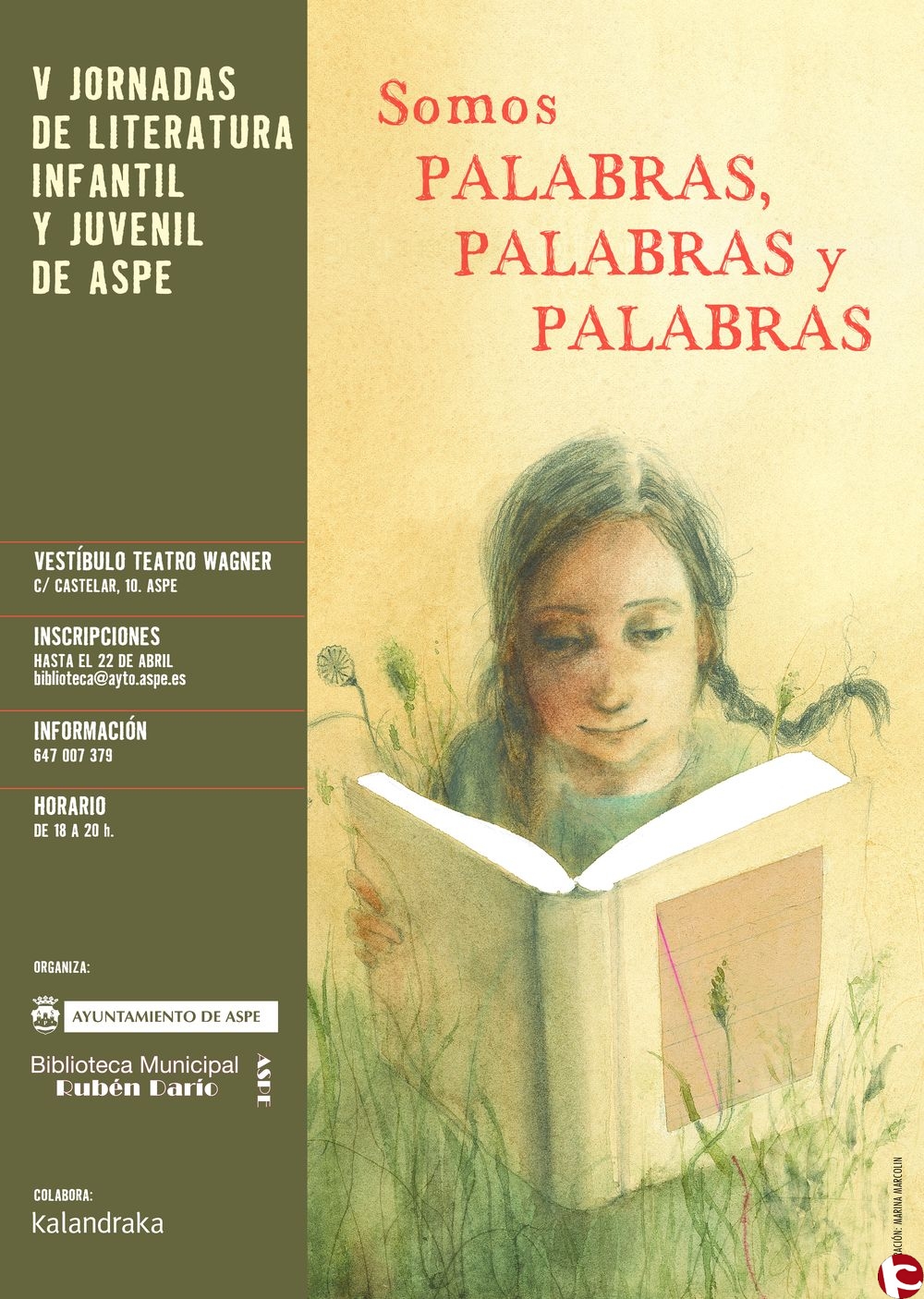 El mes de abril en Aspe también será de fuerte presencia de la literatura en las actividades organizadas por la concejalía de Cultura del Ayuntamiento. A través de la Biblioteca municipal Rubén Darío, la quinta edición consecutiva de las jornadas de literatura infantil y juvenil abrirá sus puertas en el vestíbulo del teatro Wagner del 25 al 27 del presente mes bajo el sugerente título de Somos palabras, palabras y palabras, con la presencia de tres importantes especialistas con proyección internacional en la narración oral y la escritura en el género como son Federico Martín, Pep Bruno y Estrella Ortiz. El foro cuenta de nuevo con la estrecha colaboración de la editorial Kalandraka, todo un referente de la difusión de la literatura dirigida a niños y jóvenes, y se dirige a docentes, profesionales, padres y, en general, cualquier persona relacionada con el ámbito de la educación para adquirir conocimientos y técnicas en el fomento de la lectura entre la población más joven. Las plazas son limitadas (60) y las inscripciones se llevan a cabo en el correo biblioteca@ayto.aspe.es hasta el próximo día 22. El horario de las sesiones será de 18 a 20 horas.