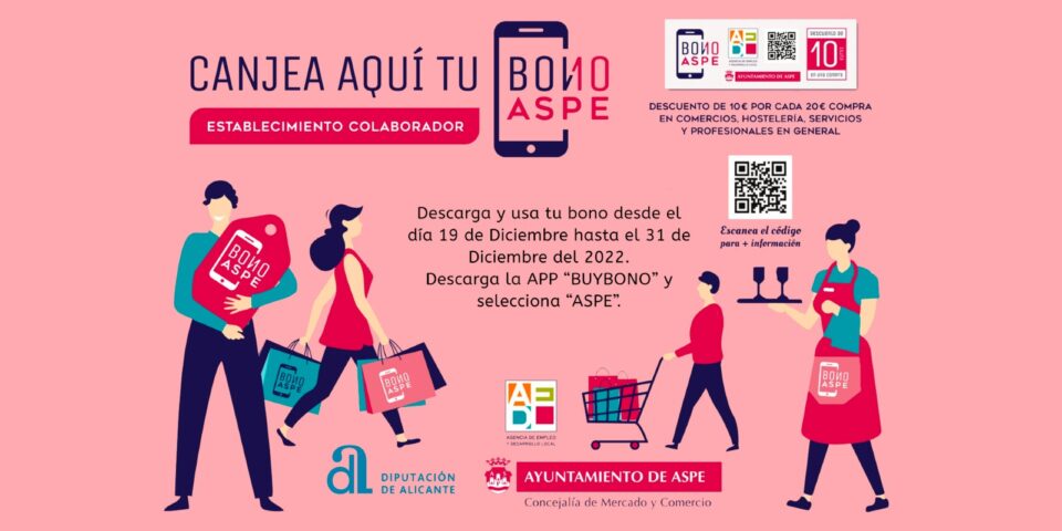 Desde la Concejalía de Comercio informa de que los consumidores de Aspe se podrán beneficiar de los bonos con descuento de 10 euros por cada 20 euros de compra en comercios, hotelería, servicios y profesionales en general desde hoy lunes 19 de diciembre, donde los consumidores podrán descargar sus descuentos.
