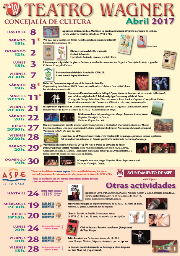 Desde el Ayuntamiento de Aspe nos remiten el cartel de las actividades culturales que se van a llevar a cabo durante el mes de abril en el Teatro Wagner así como otras actividades de Cultura y Juventud.