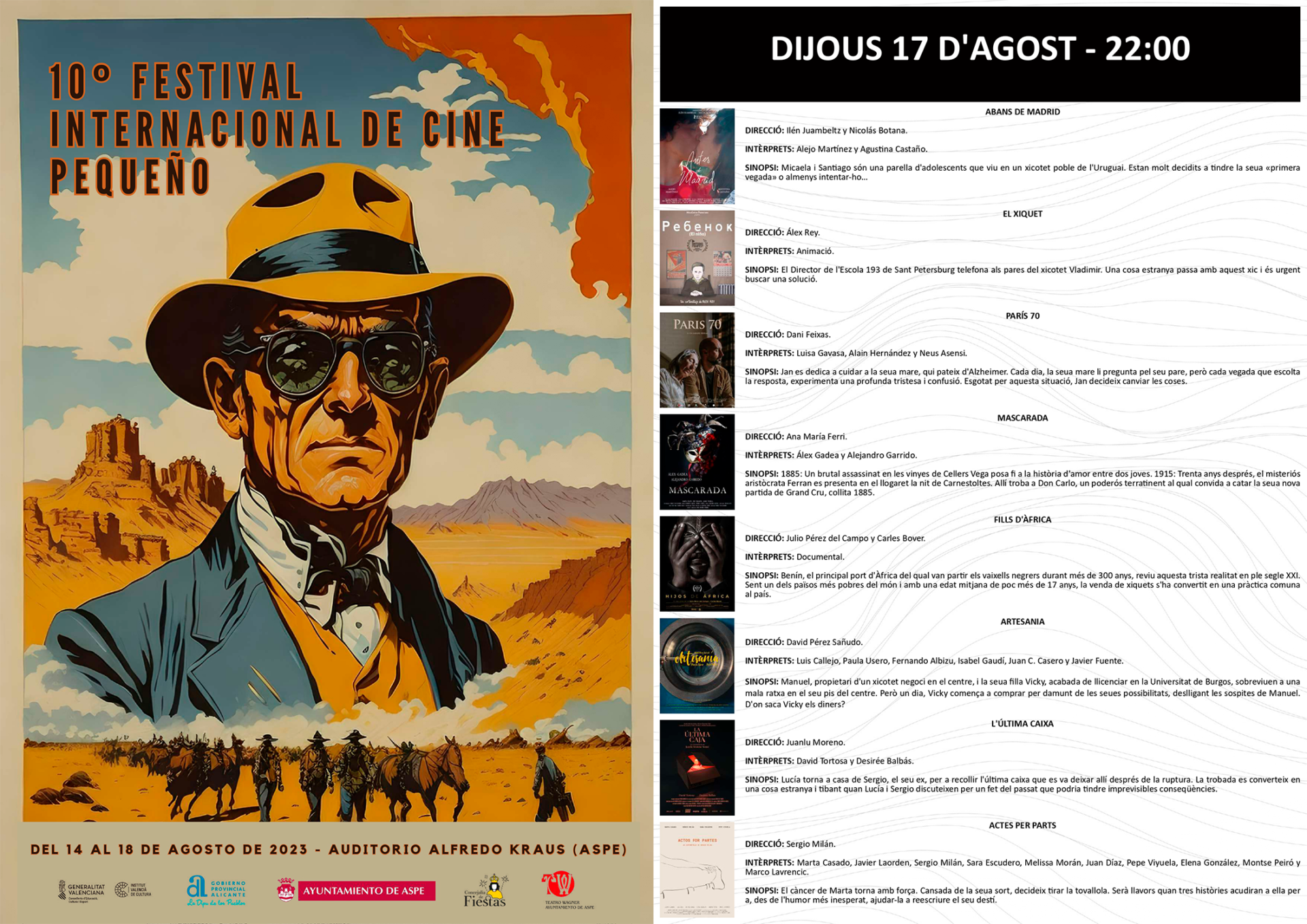 El Festival Internacional de Cine Pequeño de Aspe regresa para celebrar su décima edición; consolidándose como uno de los eventos estivales más destacados en el panorama cultural de la provincia de Alicante. Del 14 al 18 de agosto, el auditorio Alfredo Kraus acogerá las proyecciones que atraerán a los amantes del cine en formato corto.