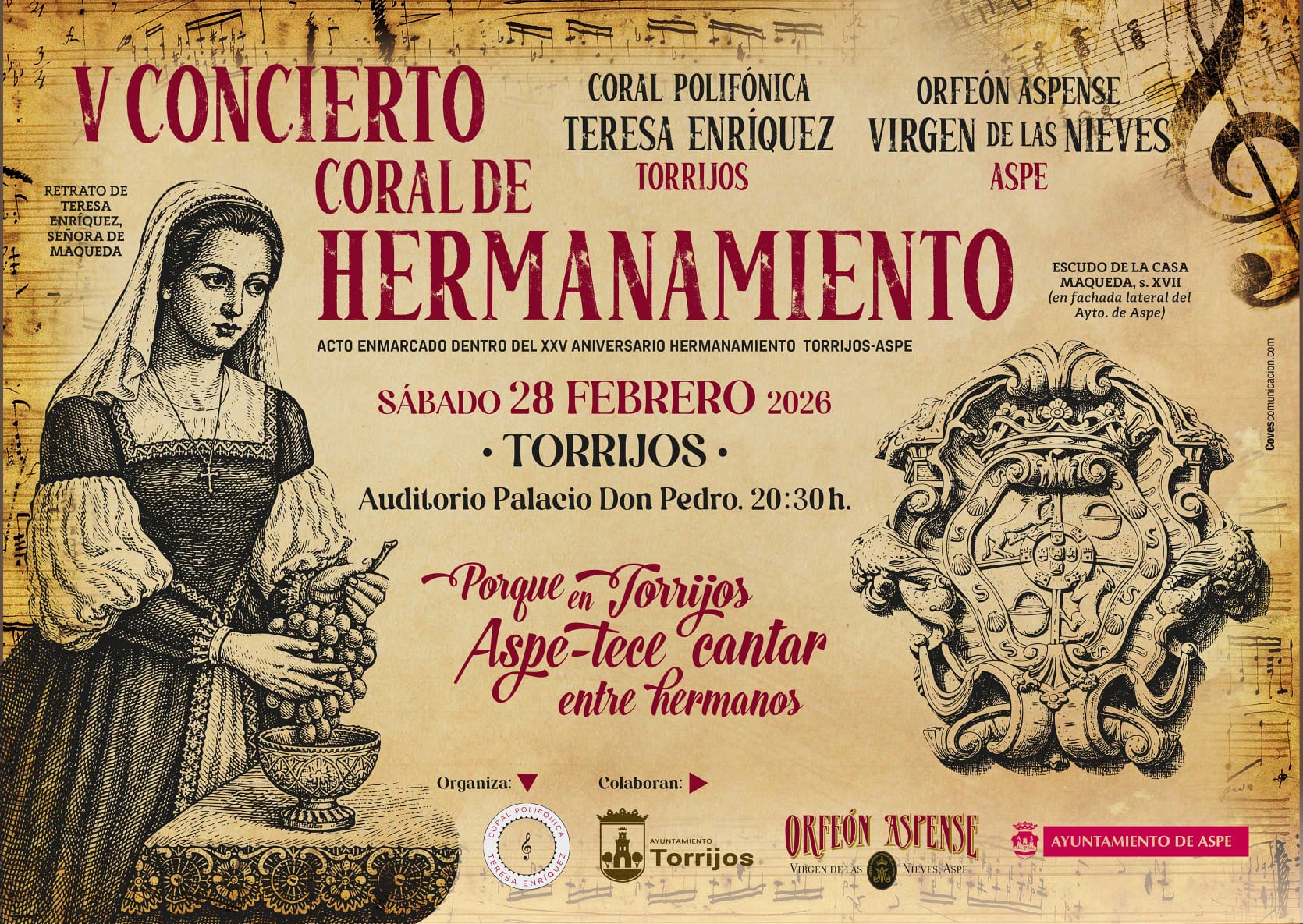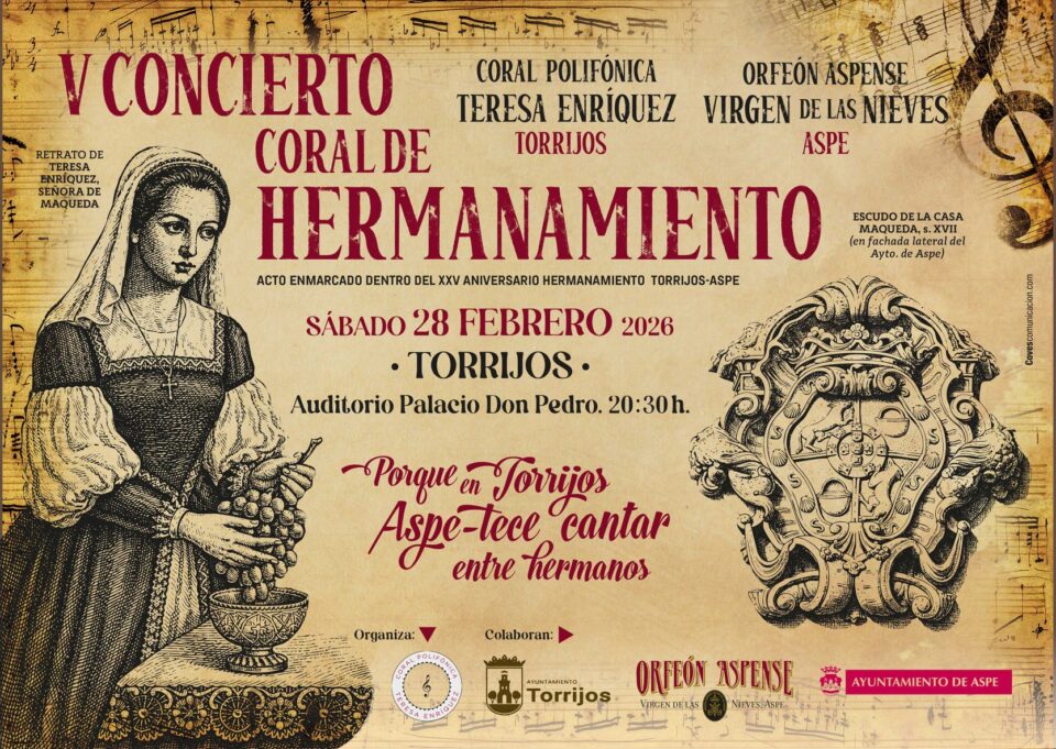 El evento reunirá sobre el escenario a la Coral Polifónica Teresa Enríquez de Torrijos y al Orfeón Aspense Virgen de las Nieves, en un encuentro musical que simboliza la unión cultural y afectiva entre ambas localidades tras un cuarto de siglo de relaciones institucionales y sociales.