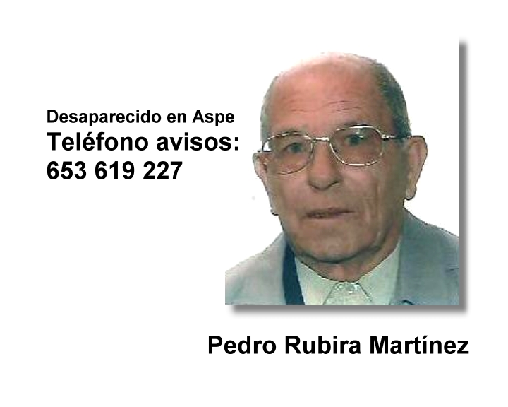 Desde la mañana de ayer sábado se encuentra desaparecido de su domicilio Pedro Rubir Martínez, vecino de Aspe, de 77 años.