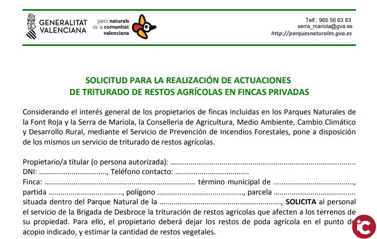 Considerando el interés general de los propietarios de fincas incluidas en el Parque Natural de la Sierra de Mariola, la Conselleria de Agricultura, Medio Ambiente, Cambio Climático y Desarrollo Rural, mediante el Servicio de Prevención de Incendios Forestales, pone a disposición de dichos propietarios un servicio de triturado de restos agrícolas.